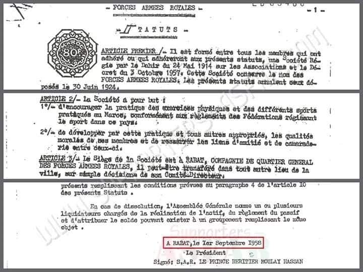 النص الأصلي باللغة الفرنسية FORCES ARMÉES ROYALES STATUTS Il est formé entre tous les membres qui ont adhéré ou qui adhéreront aux présents statuts, une Société régie par le Dahir du 24 Mai 1914 sur les Associations et le Décret du 3 Octobre 1957. Cette Société conserve le nom des FORCES ARMÉES ROYALES, les présents statuts annulent ceux déposés le 30 Juin 1924 ARTICLE 1 : la sociète a pour but d’encourager la pratique des exercices physiques et des différents sports pratiqués au Maroc, conformément aux règlements des Fédérations réglementant …